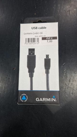Cabo USB da marca Garmin, novo e na embalagem original. - Tipo de conector: USB A para Mini USB. - Referência: 010-10723-01. - Preço original: 7,00 €.
