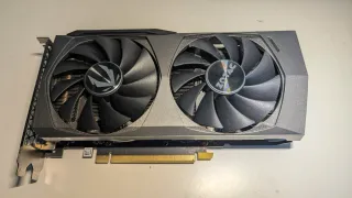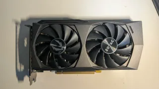 Placa gráfica Nvidia RTX 3060 Ti com design moderno e dois ventiladores para refrigeração. - Design com duas ventoinhas. - Acabamento em preto e cinza. Troquei por uma rtx 5060, bem como o processador. Alguns jogos encravavam, mas não sei se será da gráfica,por isso é que estou a vender por um valor mais baixo.
