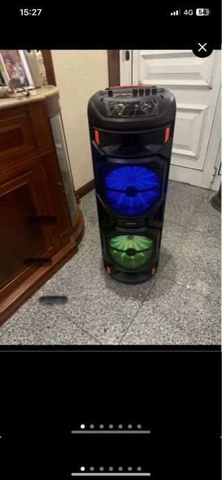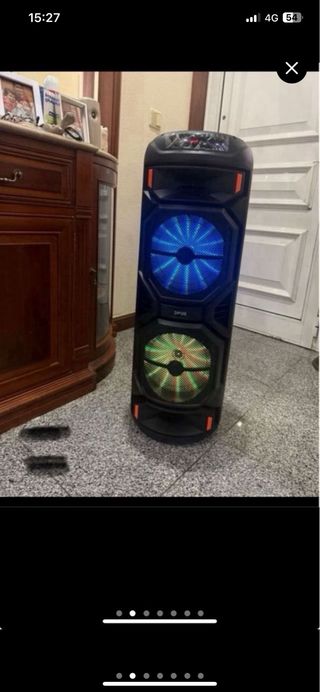 Coluna de som Bluetooth com função karaoke. Possui um design moderno e luzes LED. - Luzes LED integradas. - Conectividade Bluetooth. - Entrada para microfone.