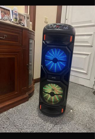 Coluna de som com luzes LED e função karaoke. - Design moderno em preto e azul. - Ideal para festas e eventos.
