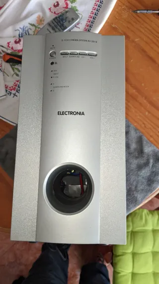 Sistema de som envolvente 5.1 CH de marca ELECTRONIA. - Modelo: AV-2010 - Múltiplos modos de som: 2CH, INPUT, 5.1CH, SURROUND MODE - Controles de volume e entrada na parte frontal. Comando e cabos.