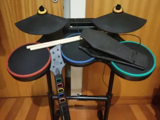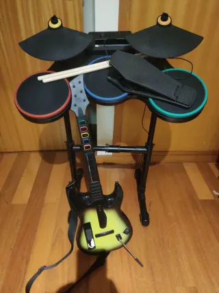 Conjunto de guitarra e bateria para o jogo Guitar Hero no Wii. - Inclui guitarra com botões coloridos. - Bateria com pads e pratos. - Pedal de bumbo.