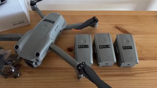 Conjunto de drone DJI Mavic Air 2S. - Incluye drone, control remoto e bolsa de transporte. - Baterias adicionais. - Hélices de reposto.