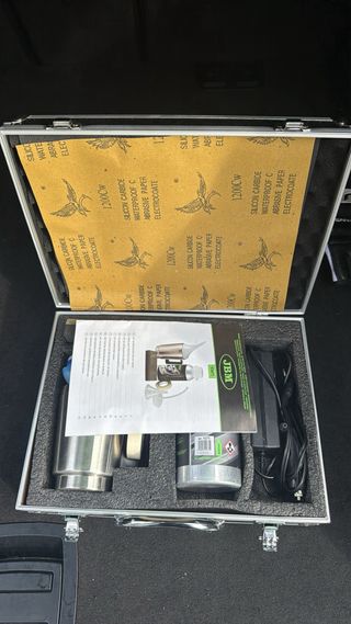Kit de polimento de faróis da marca JBM. Foi usado apenas uma vez. - Inclui lixas de grão 1200. - Recipiente metálico. - Frasco de produto de polimento. - Carregador.