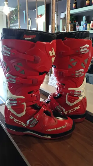 Enduro motocross KTM sherco Husqvarna gásgas TPI Sidi Fox beta alpinestars gaerne rieju airoh aviator leatt Botas de moto TCX Competizione em vermelho, tamanho 45. - Design robusto e protetor. - Fechos ajustáveis para um ajuste seguro. - Sola de borracha para aderência.