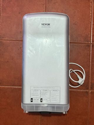 Secador de mãos da marca VEVOR, com um design moderno e elegante. - Cor prateada com detalhes em branco. - Inclui manual de instruções com avisos e cuidados. - Possui indicações para o reservatório de água e filtro de ar.