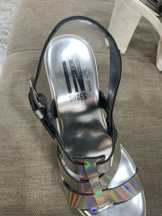 Sandália de plataforma com um design holográfico vibrante. Perfeita para adicionar um toque de brilho ao seu visual. - Material sintético com efeito holográfico. - Fecho de fivela ajustável. - Sola grossa e robusta.